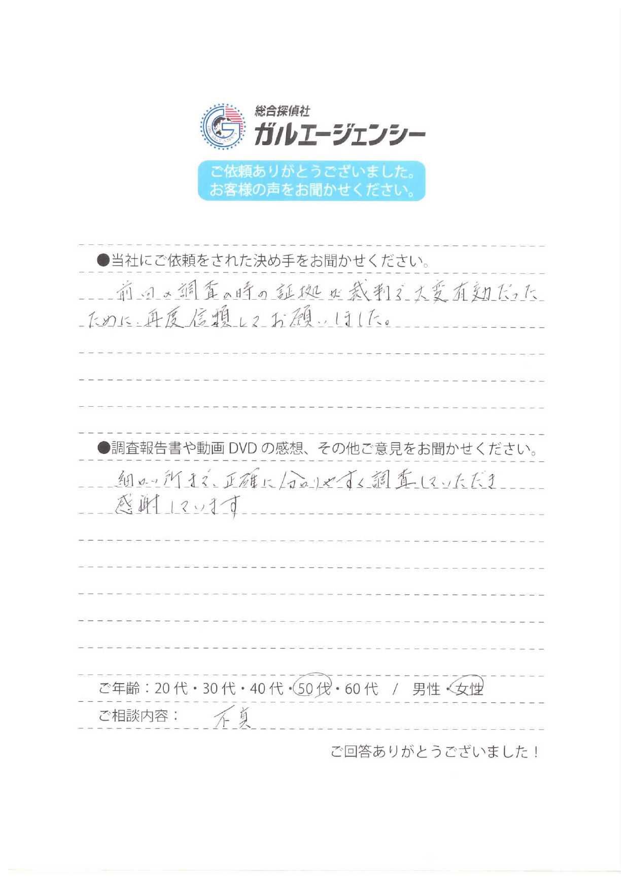前回の調査の時の証拠が裁判でも大変有効出たため、再度依頼してお願いしました。